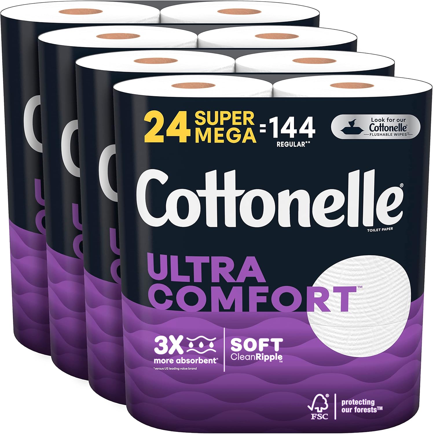 - 24 SUPER MEGA ROLLS: Cottonelle Ultra Comfort Toilet Paper, 2-Ply, 24 Super Mega Rolls (4 packs of 6); 402 sheets per roll